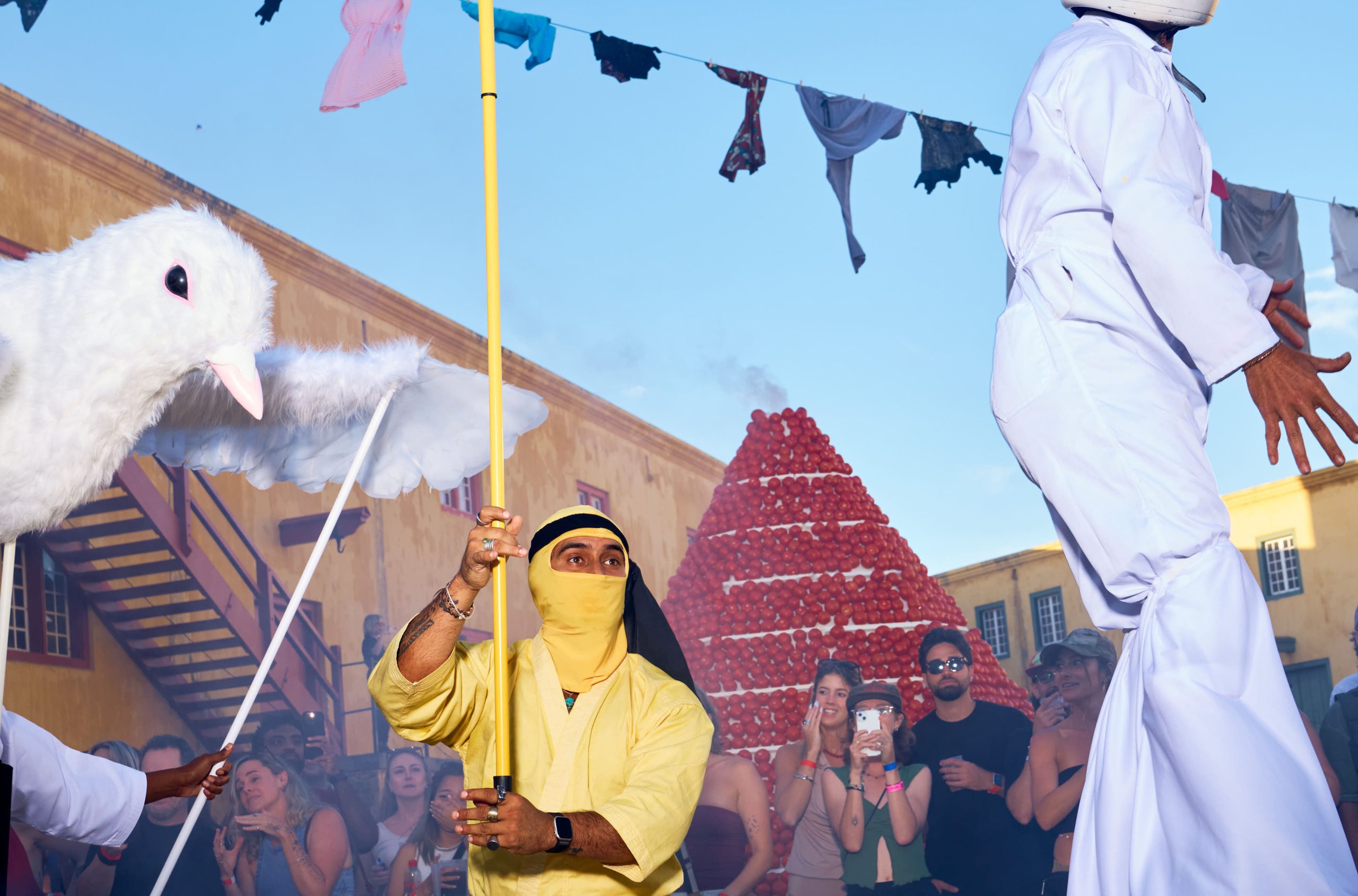 Start with the venue itself. The Castle of Good Hope is already a striking, historically loaded space. But Kiss Kiss didn’t just use it as a backdrop — they activated it. Ninjas dressed in all yellow paraded along the top of the castle walls. Astronauts on stilts moved through the crowd. A towering pyramid of real tomatoes stood as an art installation you didn’t expect but somehow couldn’t stop looking at. A RedBull station sat inside a hollowed-out concrete pool. Every corner had been considered, every detail deliberate.